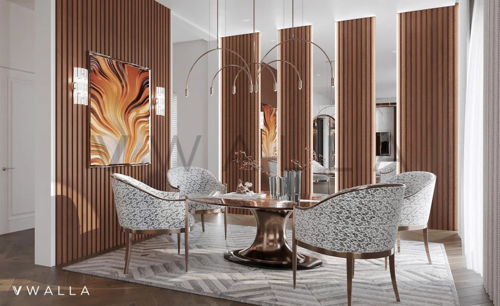 This project features a modern dining space enhanced with wall panels, creating a clean and elegant atmosphere for everyday dining.
